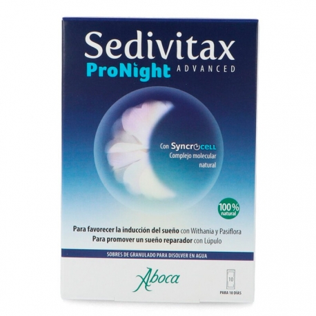 El Aboca Sedivitax Pronight Advanced es un producto 100% natural que nace de las avanzadas plataformas científicas de investigación de Aboca, las cuales han permitido desarrollar el innovador complejo molecular Syncrocell, rico en flavonoides y withanólidos, compuestos presentes de forma natural en pasiflora, lúpulo y withania. Su formulación exclusiva ayuda a promover el sueño, gracias a la presencia de los extractos de pasiflora y withania. También es útil en caso de dificultad para conciliar el sueño, por su efecto favorecedor del sueño reparador, gracias al extracto de lúpulo. Además, gracias al complejo molecular Syncrocell, el producto tiene un mecanismo de acción único, ya que predispone a todo el organismo a un estado metabólico nocturno.