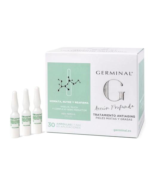 El Germinal Acción Profunda Antiaging es un tratamiento hidratante y purificante antiedad diseñado específicamente para pieles mixtas y grasas. Se presenta como una emulsión ligera con SPF 30, de tacto ligero y rápida absorción, indicada para combatir los signos del envejecimiento en rostro, cuello y escote. Aporta nutrientes que hidratan y remodelan el óvalo facial.