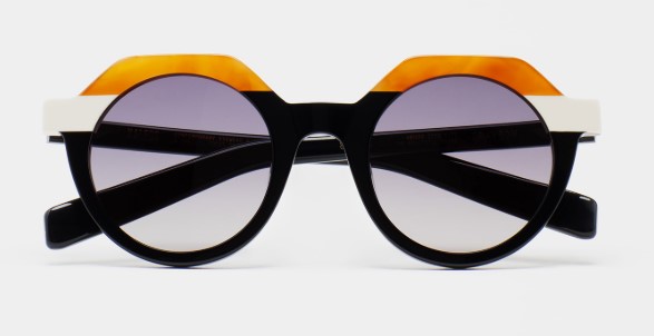 Gafa de sol de acetato negro con doble laminado havana marrón miel y blanco. Forma redondeada con la parte superior ligeramente más recta. Varillas de acetato. Lente negra degradada base 2 con 100% protección UV y tratamiento anti-reflejante. Lente Categoría 2. Plaquetas de acetato incorporadas. Hecha a mano.