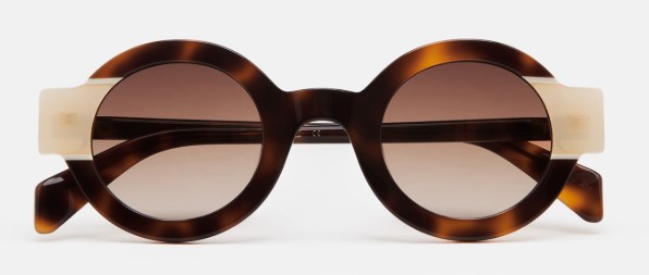Gafa de sol de forma redonda. Frontal de acetato havana marrón con doble laminado beige translúcido y blanco. Varillas de acetato havana marrón. Lente ámbar oscura degradada base 2. Lente Categoría 2. Plaquetas de acetato incorporadas. Hecha a mano.