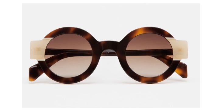 Gafa de sol de forma redonda. Frontal de acetato havana marrón con doble laminado beige translúcido y blanco. Varillas de acetato havana marrón. Lente ámbar oscura degradada base 2. Lente Categoría 2. Plaquetas de acetato incorporadas. Hecha a mano.