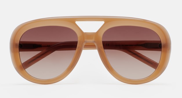 Gafa de sol de forma aviador Kaleos con fresado en todo el frontal de la gafa. Frontal y varillas de acetato. Lente base 2 con 100% protección UV y tratamiento antirreflejante. Lente Categoría 3. Plaquetas de acetato incorporadas. Hecha a mano.