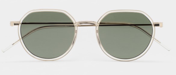 Gafa de sol de forma pantos con la parte superior ligeramente mas recta. Frontal de titanio dorado con cerquillo de acetato high density cristal transparente. Varillas y puente de titanio dorado. Varillas con terminal en acetato cristal transparente. Lente verde mineral base 2 con 100% protección UV y tratamiento antirreflejante. Lente categoría 3. Plaquetas de acetato incorporadas. Hecha a mano.