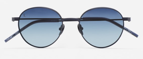 Gafa de sol de forma pantos. Frontal y varillas de titanio azul. Varillas con terminal de acetato azul oscuro transparente. Lente azul oscura degradada base 2 con 100% protección UV y tratamiento antirreflejante. Lente categoría 3. Plaquetas incorporadas. Hecha a mano.